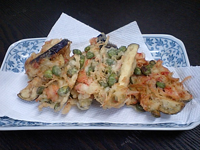 それではと、ナス、カニカマ、ジャガイモと枝豆をかき揚げで天ぷらにしてみました。